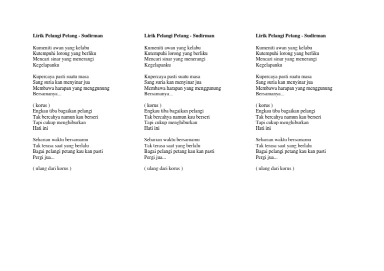 G gugup tak bergerak. Mimpi adalah kunci Untuk kita menaklukkan dunia Berlarilah tanpa lelah Sampai engkau meraihnya Laskar pelangi Takkan terikat waktu Bebaskan mimpimu di angkasa. Lirik Lagu Pelangi Petang Sudirman Hj Arshad.